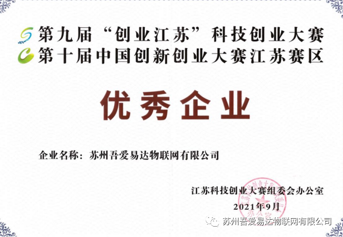 吾爱易达荣获第九届“创业江苏”科技创业大赛优秀企业奖发表时间:2021-09-23 14:50 近日,第九届“创业江苏”科技创业大赛的首场行业赛在南通创新区正式拉开大幕,来自江苏全省各地的创新团队和企业的569个创业项目同场竞技。大赛分别围绕生物医药、高端装备制造、新材料、新能源和新能源汽车、节能环保和新一代信息技术6场行业赛来展开。苏州吾爱易达物联网有限公司有幸参加新一代信息技术行业赛,并在大赛中获得优秀企业奖,这表明吾爱易达所展现的先进产品与技术进一步得到专业机构和行业社会的高度认可。