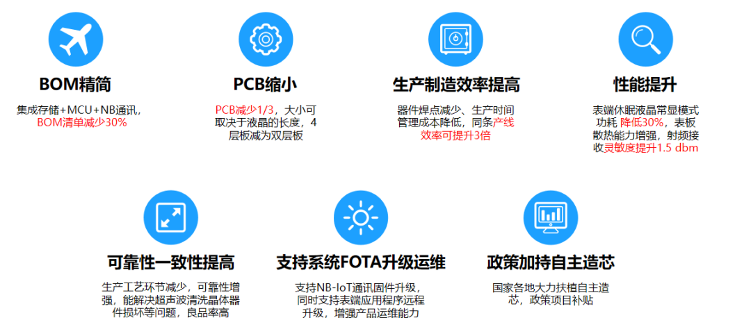 1、BOM精简:可省去NB-IoT智能燃气表主控MCU、NB-IoT模组通信电路和存储电路,单芯片SNS521H可完全替换。 2、PCB缩小:表板PCB可减少1/3,最终大小可取决于LCD大小,PCB减小,最终整表外壳体积缩小,减少整表成本。